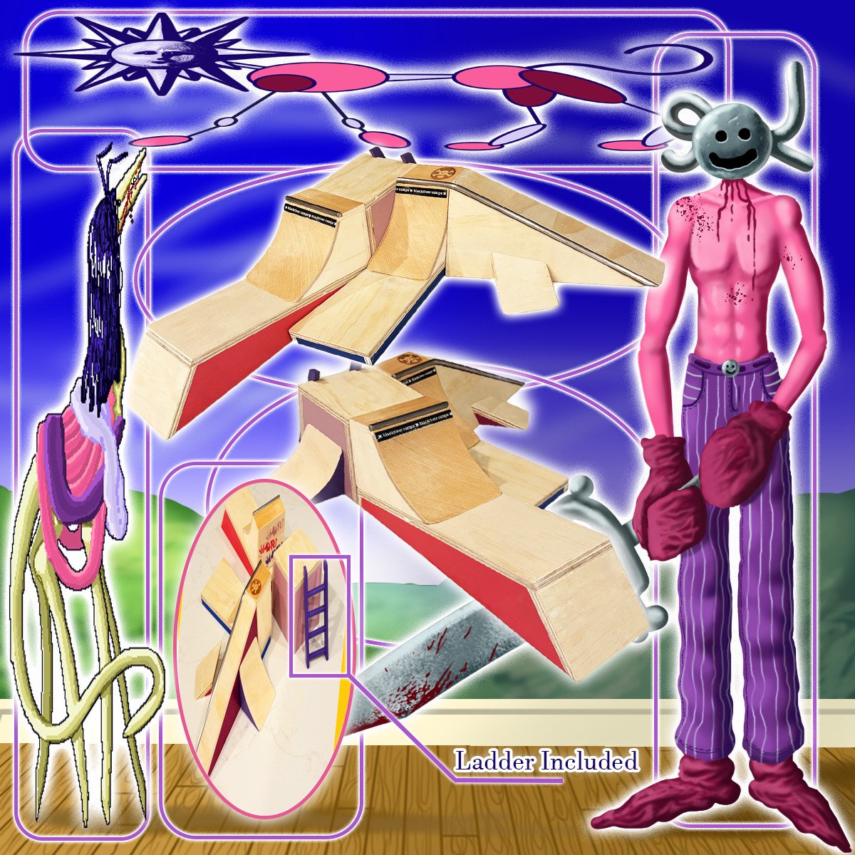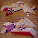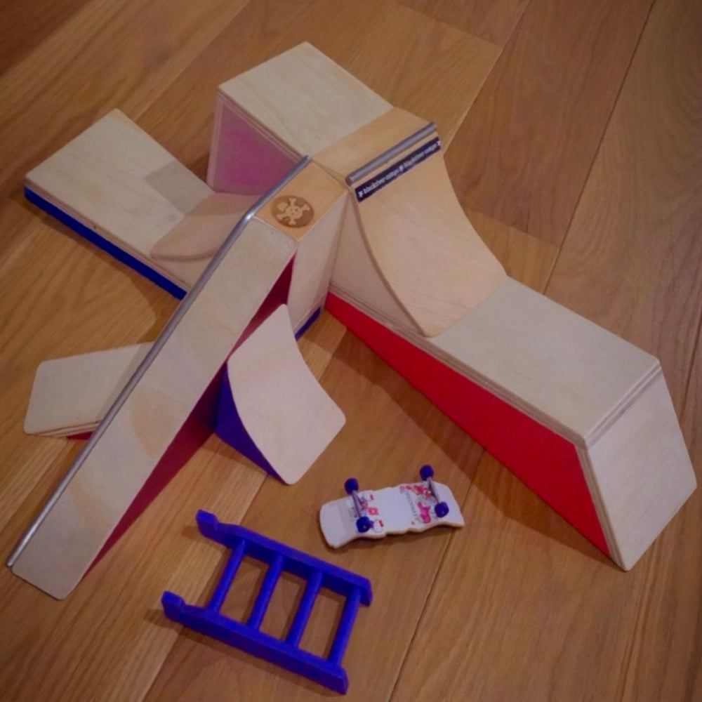 - other half of the pocket quarter glued and nailed to a manual pad, snowplowed, and attached to bank to flat that is all connected by steel coping. designed to fit on whatever side of the platforms. (blue, sparkly red-purple)